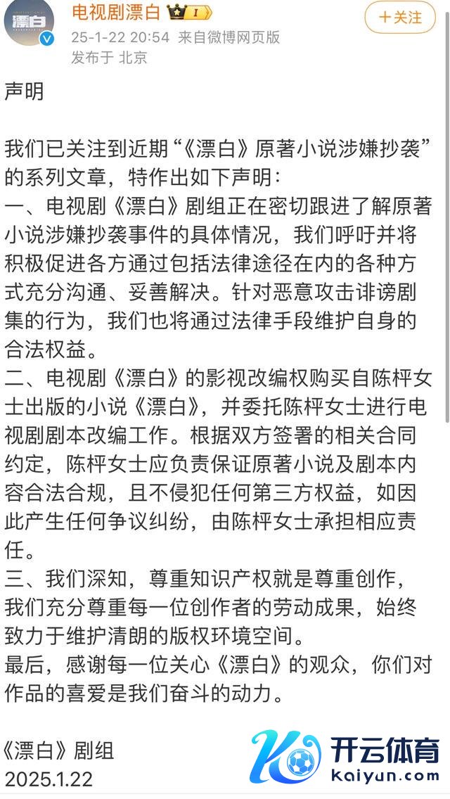 1月22日晚,电视剧《漂白》在官方微博发布声明,称已眷注到原著演义涉嫌抄袭的系列文章,正在密切跟进了解具体情况。剧方暗意,电视剧的影视改编权购买自陈枰同名演义,并委派陈枰进行电视剧脚本改编责任;把柄协议商定,陈枰应肃穆保证原著演义及脚本本色正当合规,且不骚扰任何第三方权益,如因此产生争议纠纷,由陈枰承担相应背负。