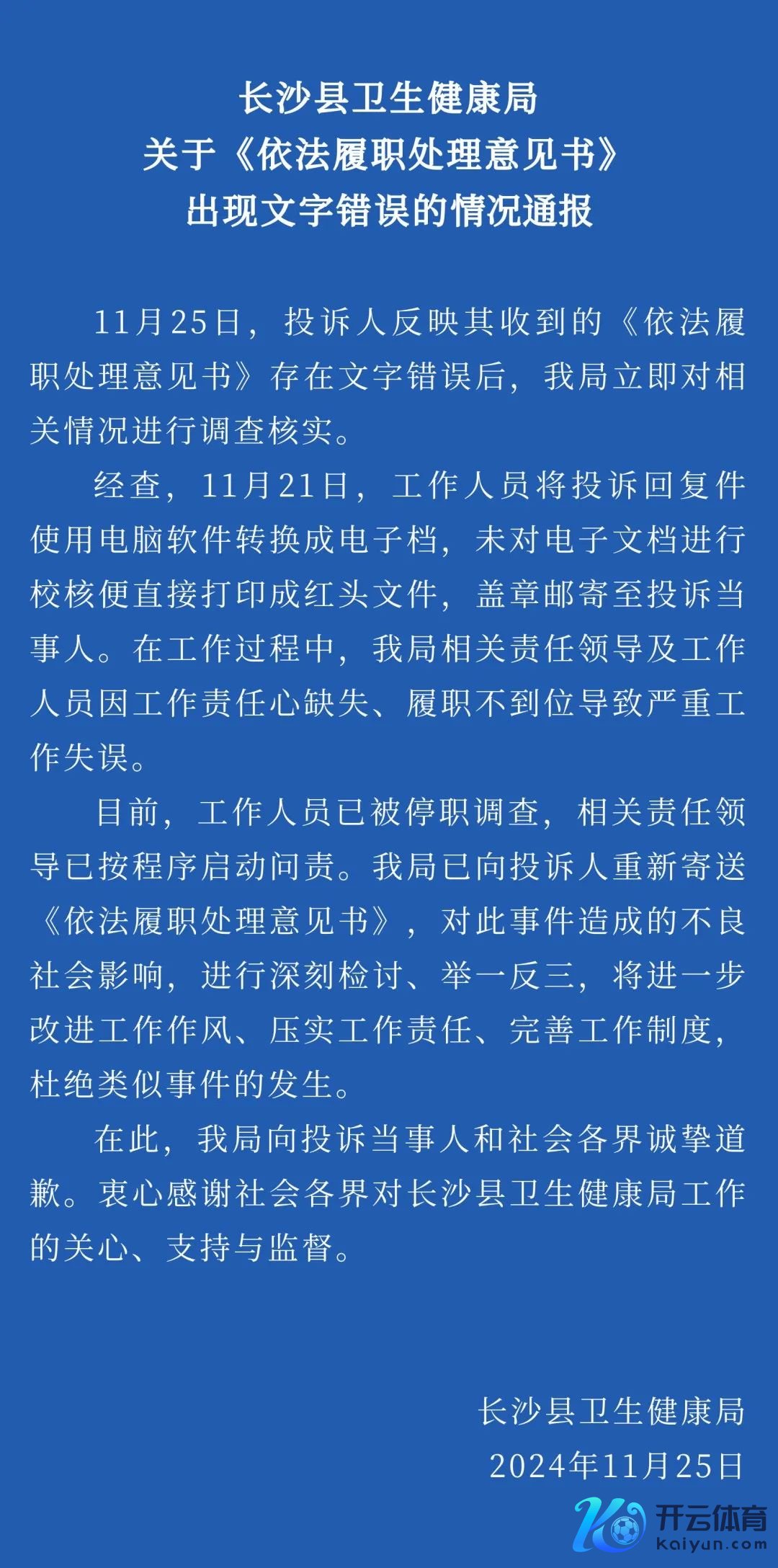 近日,有网友在酬酢平台公开了一份湖南长沙县卫生健康局向他出具的《照章履职贬责观点书》,文献仅200余字,却有多达7处错别字,且存在明显语法邪恶,激励热议。