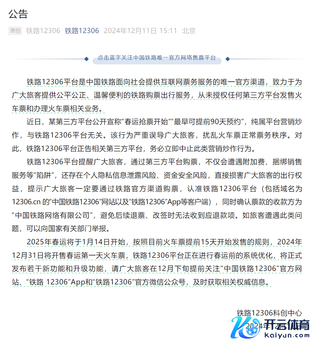 凯时体育游戏app平台铁路12306平台正告关系第三方平台-尊龙凯龙时(中国)官方网站 登录入口