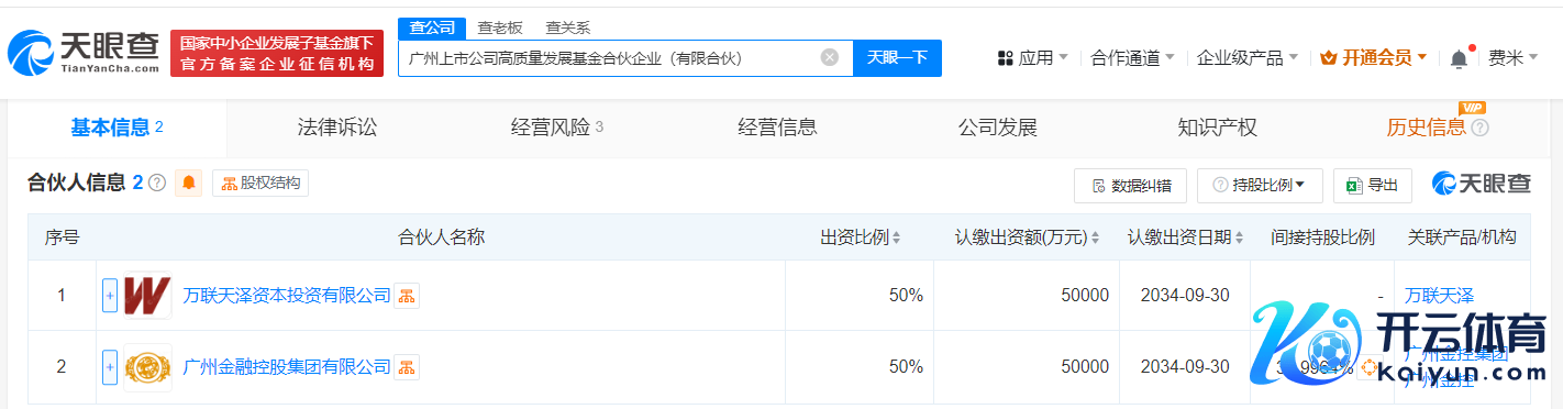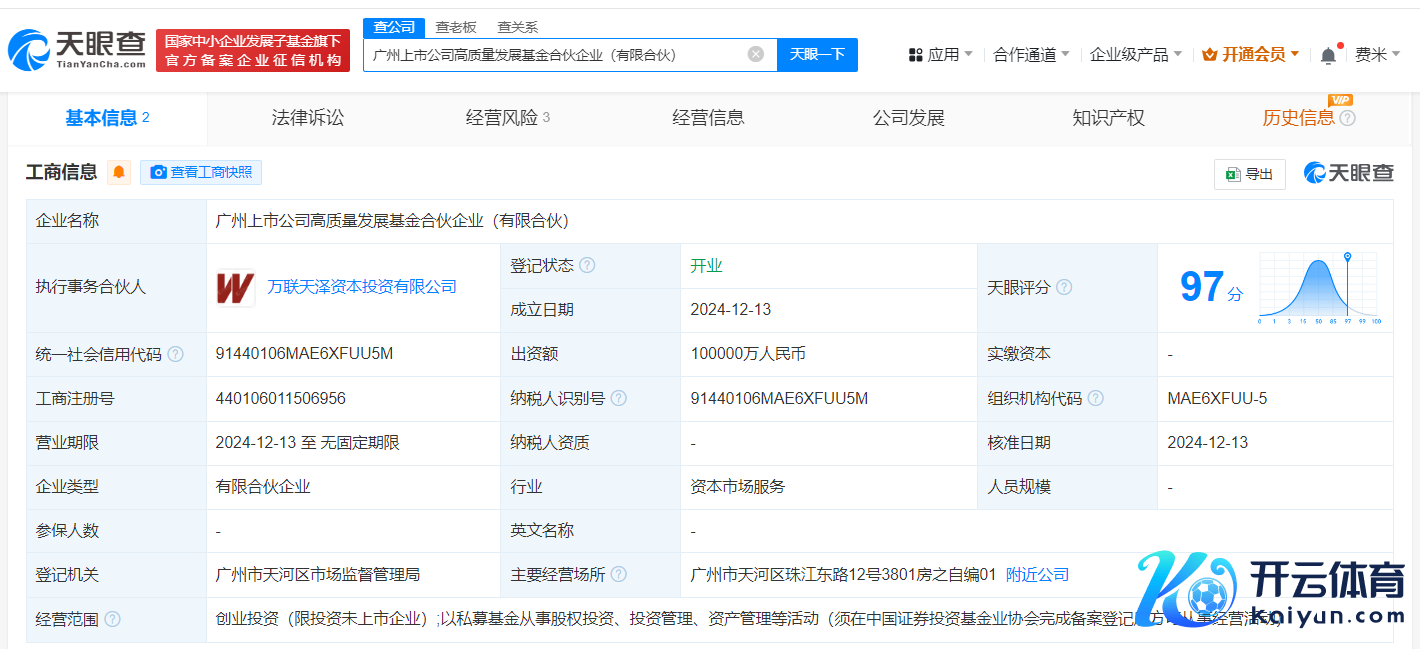 每经AI快讯凯时体育游戏app平台,天眼查App显露,近日,广州上市公司高质地发展基金联合企业(有限联合)成立,本质事务联合东说念主为万联天泽老本投资有限公司,出资额10亿元东说念主民币,盘算限制为创业投资,以私募基金从事股权投资、投资解决、金钱解决等活动,由万联天泽老本投资有限公司、广州金融控股集团有限公司共同出资。