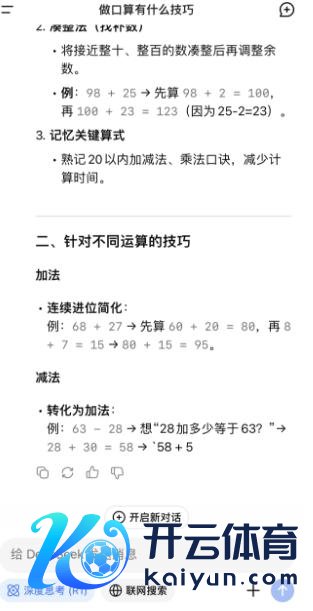 李女士的犬子刚上一年事,学校的口算寒假功课是她最不爱做的,拖沓到还有三天就要返校了,一半的任务还没完成。"小孩对 AI 很兴趣,我就让她我方和 DeepSeek 对话,问口算有什么妙技,厌世 DeepSeek 经由 32 秒深度念念考,给出了特别亲切的对话,荟萃我方的口算训戒,给出了判辨数字法、凑整法(找补数)、记挂关节算式等要领,太神奇了!"不外李女士也示意,这是为了治愈孩子的学习风趣才让她体验了一下。孩子打基础时,如故要按照门径来学习,是以她准备临了几天把孩子放到托管班,我方进修口算。