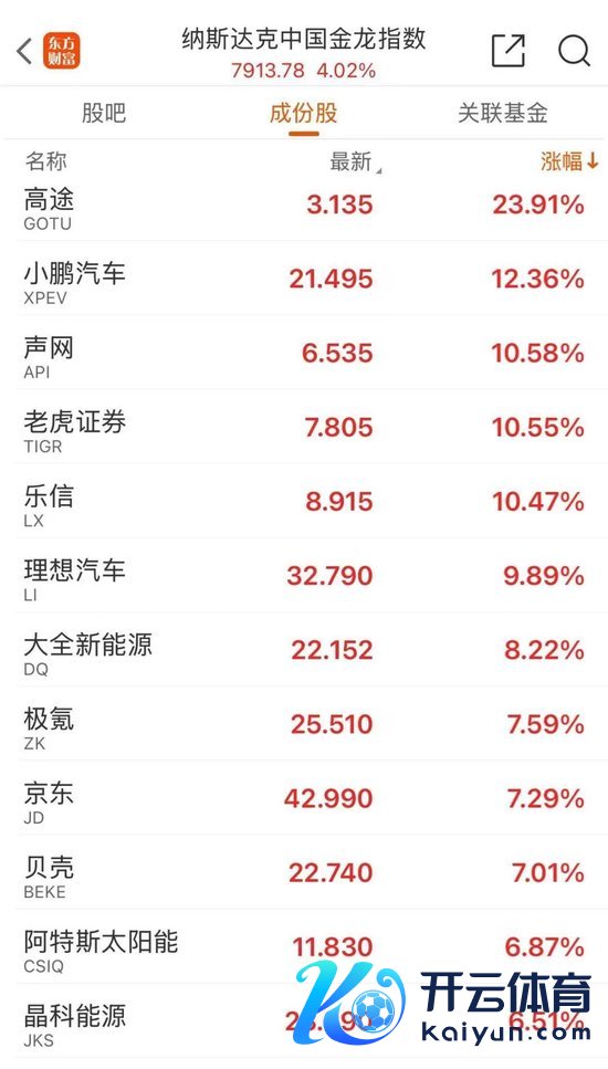 甘休收盘,纳斯达克中国金龙指数涨3.66%;高途涨近32%,小鹏汽车涨近15%,蔚来、理思汽车涨超10%,老虎证券、富途控股涨逾9%,京东涨超6%,阿里巴巴涨近4%。
