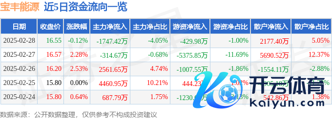本站音信,畛域2025年2月28日收盘,宝丰动力(600989)报收于16.55元,着落0.12%,换手率0.35%,成交量25.89万手,成交额4.31亿元。