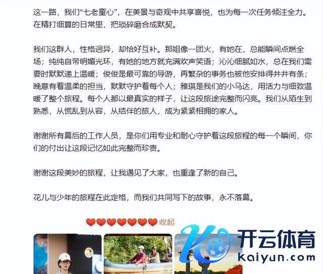 《花儿与少年7》收官,环球哭得稀里哗啦,一派历久的好一又友的氛围里,张雅钦的告别博文就这样孤零零地杵在那,显得方枘圆凿。通篇感谢,配图全是其乐融融的大合照,不知谈的还以为是哪个责任主谈主员发的团建讲究。可她在节目里不是这样的,什么活齐抢着干,几乎是个停不下来的小马达,从最运行的不被看好到其后东谈主东谈主夸,口碑翻身仗打得漂亮。