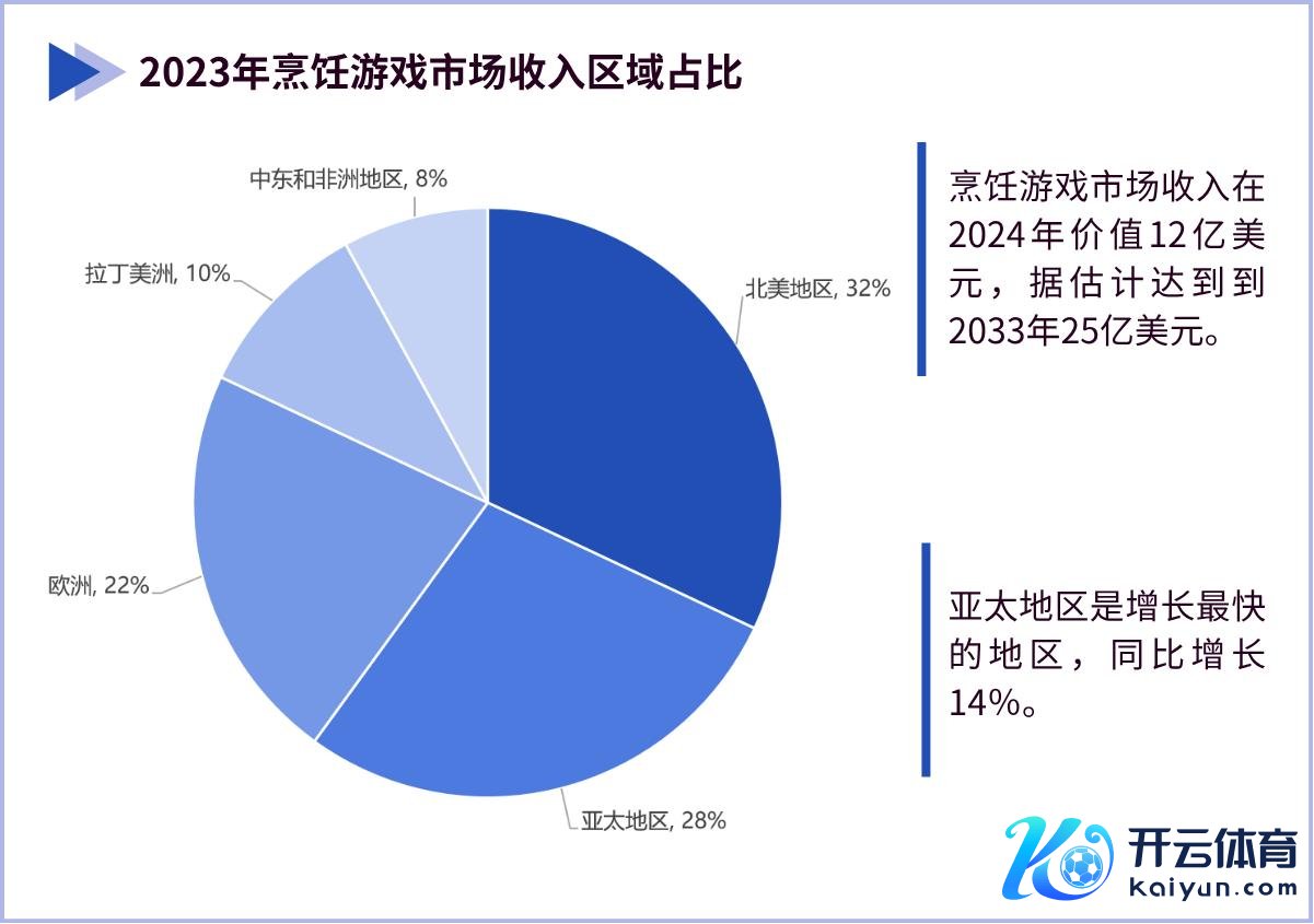 数据骄气,烹调游戏市集收入在2024年已达到12亿好意思元,瞻望到2033年将增长至25亿好意思元。在区域孝敬上,北好意思和亚太地分裂别以32%和28%的占比跳跃,紧随后来的是欧洲(22%)、拉丁好意思洲(10%)以及中东和非洲(8%)。其中,亚太地区是增长最快的市集,同比增长率高达14%。