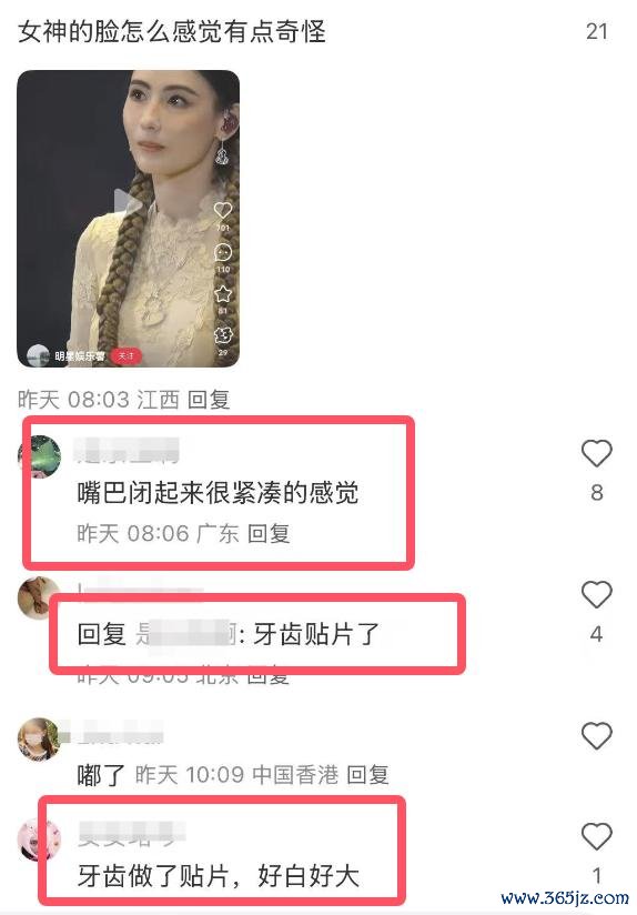 在批驳区,有许多知情的网友们涌现,说张柏芝是牙齿"作念了贴片,很白很大"。