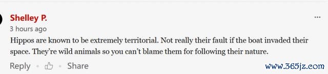 "家喻户晓,河马是极具领地意志的。如果有船侵入它们的领地,这并非它们的过错。它们是野天真物,是罢免天性行事。在这点上,它们没作念错什么。"