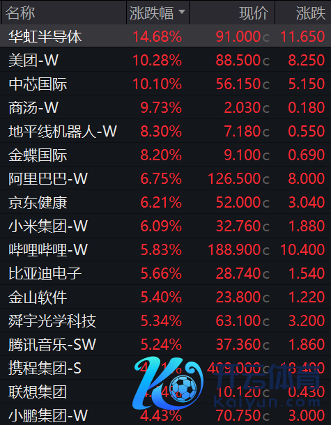 科网股全线走高,好意思团、中芯海外涨超10%,商汤涨超9%,阿里巴巴涨超6%,携程集团、联念念集团涨超4%,腾讯控股、京东集团涨超3%,百度集团、网易涨超2%。
