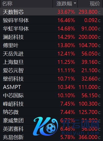 半导体板块强势领涨,天数智芯涨33%,华虹半导体、澜起科技涨超14%,上海复旦涨超11%,中芯海外涨超10%,纳芯微涨超7%,兆易翻新涨超5%。